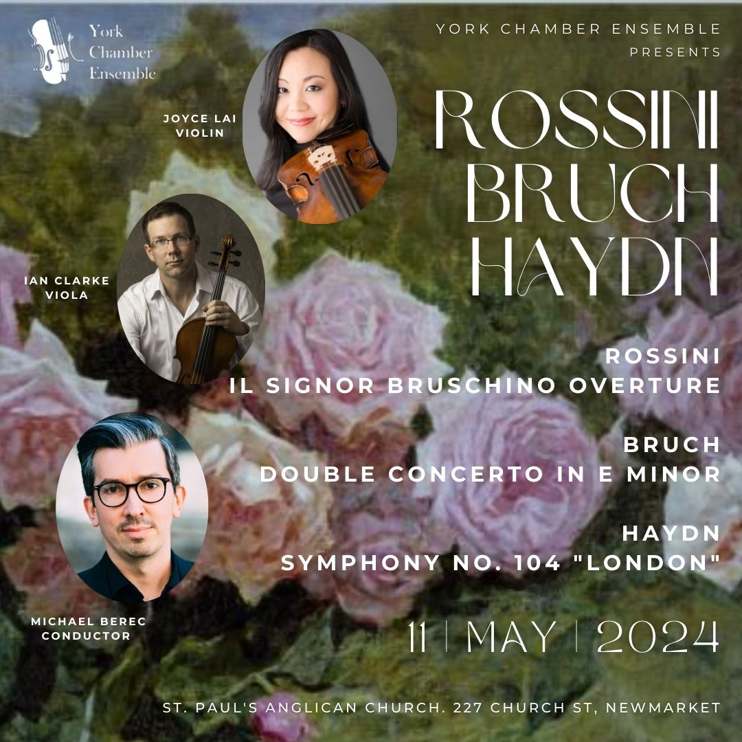 On May 11, 7:30pm at St. Paul’s Anglican Church, Newmarket, Maestro Michael Berec leads the York Chamber Ensemble in a blend of classical favourites and a rare gem from the late Romantic. Kick off the night with an exhilarating overture from Rossini’s Il Signor Bruschino, promising a delightful blend of light-heartedness and excitement, complete with thrilling crescendos and a special surprise seldom heard in concert halls. Violinist Joyce Lai and Violist Ian Clarke join forces to perform the rarely programmed, yet highly emotive Double Concerto by Max Bruch. As the evening draws to a close, immerse yourself in the grandeur of Haydn’s Symphony No. 104 “London”, the composer’s final symphonic masterpiece.