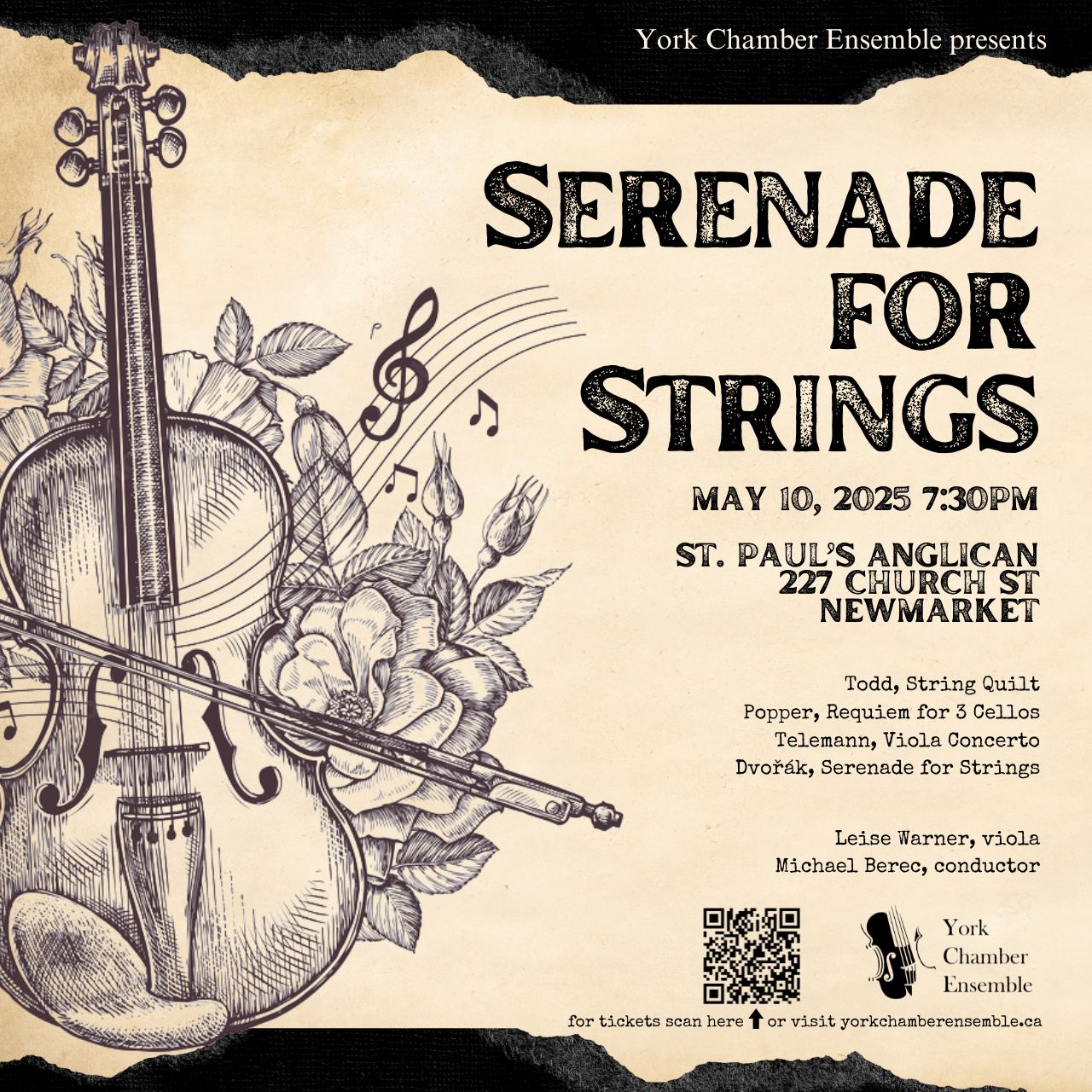 From Baroque classics to modern-day melodies, the York Chamber Ensemble performs a strings-only concert showcasing the emotional and technical prowess of the instrument. Telemann’s Viola Concerto, one of the earliest for viola, blends elegance with lively dance rhythms, highlighting the instrument’s rich tones. Dvořák’s Serenade for Strings brings warmth and charm, weaving Bohemian folk-inspired dances with tender lyricism. Popper’s Requiem for Three Cellos is a richly expressive elegy that showcases the cello’s mournful beauty through interwoven lines of lyrical melancholy and poignant harmony. The program also includes the world premiere of a new commission by Canadian composer Matthew Todd, whose innovative soundscapes add a fresh, contemporary dimension to this diverse musical journey.